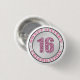 Pink Sweet Sixteen (16) milestone Birthday buttons featuring a printed glitter illustration for the "16" in a "SWEET SIXTEEN CELEBRATION" emblem design.