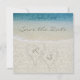 Destination Wedding - Beach - Glitter Sandy Beach Wedding Save the Date - Two hand drawn hearts appear to be written in the sand- inside personalized monograms- the sand is glitter - soft foamy tide from the ocean just touching the beach - romantic and casual. NO real glitter is used on this product, it is artistically created to look real.