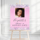 Pretty and girly sweet 16 birthday party welcome sign featuring her photo, sparkly holographic purple, pink and silver faux glitter confetti along the borders against a pink background and her name in a soft grey trendy script.