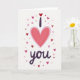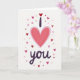 This card features the words “I love you” arranged in a vertical layout on a white background, giving the message lots of breathing room. The “I” appears as a deep purple brushstroke topped with a small red heart, like a tiny kiss above the letter ❤️. The word “love” is shown as a large pink heart with a lighter pink outline and little V-shaped speckles that feel like soft confetti around a close bond 🥰. Beneath it, “you” sits lower on the card in dark purple cursive lettering, with smooth curves that echo the heart shape above. Around the main message, smaller hearts float like a loose halo in shades of ruby red, fuchsia, and pale pink. A few of the darker red hearts have a subtle glitter-like texture that catches the eye without crowding the center. The overall look stays simple and airy, with the biggest pink heart anchoring the middle while the scattered hearts drift outward at the edges.