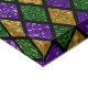 A vibrant Mardi Gras poster with shiny green, purple, and golden glittering diamonds.