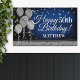 Fun banner sign for indoors or out, featuring some glam metallic balloons and glittery confetti on a rich textured royal blue background for your personalized birthday banner.