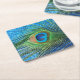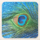 Glittery Blue Peacock Square Paper Coaster