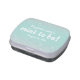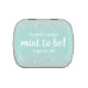 Mint green wedding favor candy tin with graphics of mint green sparkling glitter. White bold text reads mint to be! Personalize the bride and groom's names and wedding date to suit your needs. Default candy are mints but you can chose the candy type and tin style to suit your needs.