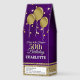 Fun personalized coffee gift, featuring gold metallic balloons & glittery confetti on a rich textured deep purple background for a one-of-a-kind birthday gift.