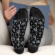 These pretty socks have a pattern of faux glitter, ornate snowflake images, all in varying sizes. The images are placed on a dramatic black background. Elegant and festive for the Holiday season and the rest of the winter, too! *Please note - the snowflake images are printed on the fabric and contain no actual glitter.