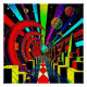 A.I. created psychedelic geometric, surreal abstract composition of globes, crescents, cubes, planets, orbs, spheres, and swirls of varying shapes and colors in an arrangement which pleased the senses of the artist.