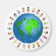 Cute illustration of a group of happy and diverse children from various countries of the world holding hands around the globe. Image available on various gifts and products.