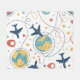 Vibrant seamless pattern blanket featuring airplanes, globes, flight paths, stars, and travel-inspired icons in a playful aviation style. Ideal for travelers, aviation enthusiasts, frequent flyers, and anyone who loves global adventure aesthetics.