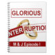 The Glorious Interruption: A Golden Beginning image features a clean, white background. It includes several text elements and a central graphic, creating a minimalist yet impactful composition. At the top, the word "GLORIOUS" is enclosed in a thin red rectangular border. The word "INTERRUPTION" is placed diagonally across the center, also framed by a red border, overlapping a graphic of two golden rings. Below the rings, the text "M & J Episode I" is similarly bordered in red, adding to the overall design.