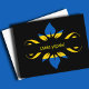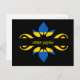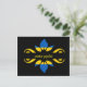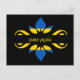 Blue and Yellow scrollwork on black postcard with Slava Ukraini in Cyrillic lettering. Cyrillic is the alphabet used in the great country of Ukraine.