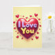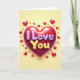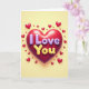 Designed with a big red heart in the center, this Valentine’s card puts love front and center. The heart looks shiny and rounded, with soft light reflecting off it like a candy surface. On the heart, the words “I Love You” stand out in raised, rounded letters, with “I Love” in light purple and “You” in yellow. Around the main heart, several smaller red hearts float in different sizes, scattered like a gentle shower. The background is a soft, creamy yellow that keeps the focus on the hearts and message. Light shading under the shapes gives everything a clear 3D look without feeling heavy. Overall, it feels sweet, romantic, and easy to give to someone special 💘❤️.