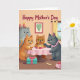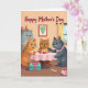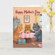 This Mother's Day card shows four human-like cats gathered in a cozy room, where three younger cats offer gifts to a darker-colored mother cat wearing a pink pearl necklace ❤️. The mother cat’s soft smile and gently extended paw meet the eager posture of the kittens, creating a tender, close-knit moment. Warm peach walls and a polished wooden floor set a homey scene, with a hint of light coming from the right side as if from a nearby window. On the wall, a framed picture features a heart-shaped leaf design, and a couple of small ceramic vases add a sweet decorative touch 🌼. A small table covered with a light pink cloth holds one wrapped present tied with a shiny golden ribbon. More presents sit on the floor, including a teal box topped with a red bow and a smaller pink package, with a little handwritten note lying nearby. The message “Happy Mother’s Day” appears in dark lettering arched across the top of the design.