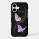 Pretty pink, purple, and green pattern silhouette butterflies are the feature on this unique phone case. Between the two butterfly images is a bright gold star cloud swirl. Your name is in matching light pink at the top right. Everything is placed on a dramatic black background.