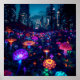 A futuristic bioluminescent mushroom forest sprawling through a twilight cyberpunk cityscape—a vibrant, surreal art print where nature meets neon