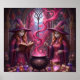 This fantasy poster features twin cat like witches in violet robes stir a heart-filled pink potion in a moonlit gothic tower, surrounded by spellbooks, potions and glowing magic.