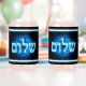 Glowing blue and white Hebrew text reading, "Shalom" (שלום - peace) superimposed on an elegant, blue, etched-look fractal image of a Star of David. Customize by adding your own text on the reverse side.