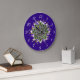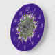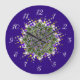 Unique wall clock featuring the glow of fractal designed Christmas trees from tree top stars bursts, purple and red ornaments, and jeweled swags on a deep purple woven textured background. Will add a festive touch to any room. We specialize in custom-made designs, contact us if you would like a unique made-to-order layout using this basic Christmas tree image.