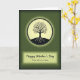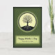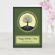 The front design shows a black silhouette of a tree centered inside a softly glowing cream circle, with visible roots spreading downward and thin branches reaching up with tiny red buds that feel like little kisses of color ❤️. A dashed ring traces around the circle, giving the emblem a stitched-look border that adds gentle texture. Behind it, the background fades from deep forest green at the edges to a brighter mossy green closer to the light, like a calm garden at dusk. Beneath the circle sits a pale, softly lit rectangular panel that frames the message. “Happy Mother’s Day” appears large across the top of the panel in flowing black lettering, and a smaller line below reads “From both of us Sister” in matching dark text. The layout feels like a quiet family moment, with the buds and roots suggesting closeness and shared growth, like two loved ones standing side by side 🌼. The cream circle glows brightest at its center, and the red buds dot the upper branches in small, spaced accents.