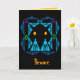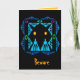 This Halloween card features a spooky face with golden glowing eyes surrounded by an ornate square geometric pattern in shades of blue with accents of green and pink. It is set on a black background for a dramatic effect. The text reads: Beware. Stay out of the woods on Halloween. It can be customized to suit your needs.
