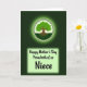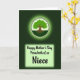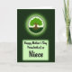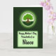 This design shows a deep green forest-like background fading darker toward the edges, with a glowing circular emblem near the top that feels like a gentle halo around the artwork. Inside the circle, a sturdy brown-trunked tree spreads outward into dense, textured green leaves, as if leaning in protectively like a caring embrace ❤️. Fine root lines curl beneath the trunk into a dark green base, suggesting closeness and steady support without needing any characters on the scene. Around the circle’s rim, small leaf-shaped accents form a soft decorative border that keeps the focus centered. Lower on the card, a pale green rectangular panel with a light glow holds the message, set neatly against the darker backdrop. The line “Happy Mother’s Day From both of us” appears across the panel in a casual, flowing dark-green style, while “Niece” sits more prominently below it in a fancier, slightly thicker dark-green lettering 🌼. The pale green panel is centered beneath the emblem, with the surrounding emerald gradient framing it like a shadowed canopy.