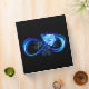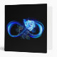 Luminous infinity symbol with glowing, beautiful, lushly blooming rose made of blue flames on black background.