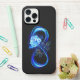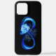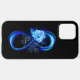 Luminous infinity symbol with glowing, beautiful, lushly blooming rose made of blue flames on black background.