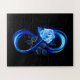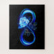 Luminous infinity symbol with glowing, beautiful, lushly blooming rose made of blue flames on black background.