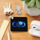 Luminous infinity symbol with glowing, beautiful, lushly blooming rose made of blue flames on black background.