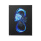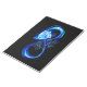 Luminous infinity symbol with glowing, beautiful, lushly blooming rose made of blue flames on black background.