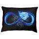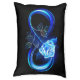 Luminous infinity symbol with glowing, beautiful, lushly blooming rose made of blue flames on black background.