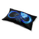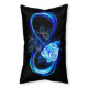 Luminous infinity symbol with glowing, beautiful, lushly blooming rose made of blue flames on black background.