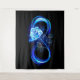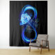 Luminous infinity symbol with glowing, beautiful, lushly blooming rose made of blue flames on black background.