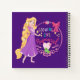 Rapunzel with flowers decorating her long hair, standing next to an ornate frame featuring the words "Glowing Like Rapunzel".