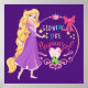 Rapunzel with flowers decorating her long hair, standing next to an ornate frame featuring the words "Glowing Like Rapunzel".
