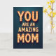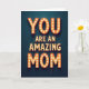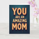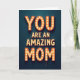 This card features a glowing marquee-style message that reads “YOU ARE AN AMAZING MOM,” arranged in three stacked lines with “YOU” at the top and “MOM” at the bottom in larger letters that gently frame the smaller middle line. Each letter has a dimensional orange-red outline filled with small round bulbs, creating a cozy, affectionate glow that feels like a sweet spotlight for someone you adore ❤️. The warm lights stand out strongly against a deep dark teal background, giving the design a stage-like look that suggests a loving celebration. The text sits centered on the front, with the brightest bulbs tracing the letter shapes so the words stay easy to read even with the dramatic contrast. The overall look leans retro, like an old theater sign, and the steady shine adds a friendly, close-to-the-heart mood without needing extra decoration 🌼. Shadows around the letter edges add depth, making the sign feel real, as if it could be switched on in a dim room. Two thin dark wires hang down from the lower right of the final “M,” adding a small realistic detail against the teal backdrop.