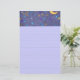 Stationery with faint gray lines and elegant vintage art of a glowing crescent moon and stars against a dark blue sky etching.