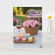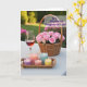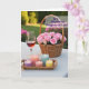 This card shows a golden-hour scene set on a pale tabletop, where a wicker basket overflowing with soft pink flowers becomes the main focus. Beside it sits a slim stemmed glass filled with a rosy drink that glints gently, like it was poured for someone special ❤️. Near the front, a small woven tray holds several candles in clear holders, their little flames flickering as if keeping quiet company. The candle colors shift in tender pastels—lavender, coral, light blue, and sunny yellow—adding a soft, friendly glow 🌼. A short message appears near the top in a warm, medium-pink font, with a smaller line of text centered near the bottom in light gray. In the background, a garden fades into a green blur, suggesting an outdoor moment shared side by side. A few bright fuchsia blooms peek through the foliage at the upper right, adding a lively splash of color.