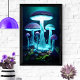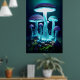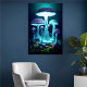 This enchanting poster captures the magical essence of a cluster of mushrooms, unlike any you've seen before. At the heart of this mesmerizing scene is the vibrant interplay of colors, where deep, mystical purples blend seamlessly with glowing cyan highlights. Each mushroom, meticulously detailed, seems to pulsate with an ethereal light, casting a serene glow that illuminates the surrounding darkness.