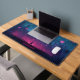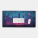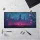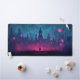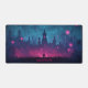 A silhouette of a child looking at a glowing fantasy city under a starry magical night sky filled with glowing orbs. This is a great design for artful and colorful desk mat lovers.