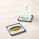 This design features an orange pumpkin that seems to be glowing in the dark. A candle lights up the eyes and a smile. A dark shadow is seen behind and to the sides of the pumpkin. A black border was added. These coasters come in round or square.