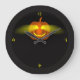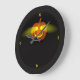 This design features an orange pumpkin that seems to be glowing in the dark. A candle lights up the eyes and a smile. A dark shadow is seen behind and to the sides of the pumpkin. Black opaques were added to this design. These clocks are also available in a round style.