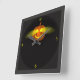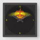 This design features an orange pumpkin that seems to be glowing in the dark. A candle lights up the eyes and a smile. A dark shadow is seen behind and to the sides of the pumpkin. Black opaques were added to this design. These clocks are also available in a round style.