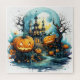 This unique Halloween jigsaw puzzle features a pair of spooky pumpkins, after dark, in front of a haunted house.