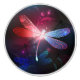 Glowing, flying, red dragonfly, with transparent, detailed wings on dark, nocturnal, luminous background with tropical plants and fireflies. Red dragonfly.