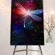 Glowing, flying, red dragonfly, with transparent, detailed wings on dark, nocturnal, luminous background with tropical plants and fireflies. Red dragonfly.