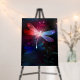 Glowing, flying, red dragonfly, with transparent, detailed wings on dark, nocturnal, luminous background with tropical plants and fireflies. Red dragonfly.