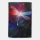 Glowing, flying, red dragonfly, with transparent, detailed wings on dark, nocturnal, luminous background with tropical plants and fireflies. Red dragonfly.