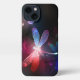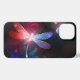 Glowing, flying, red dragonfly, with transparent, detailed wings on dark, nocturnal, luminous background with tropical plants and fireflies. Red dragonfly.