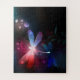 Glowing, flying, red dragonfly, with transparent, detailed wings on dark, nocturnal, luminous background with tropical plants and fireflies. Red dragonfly.
